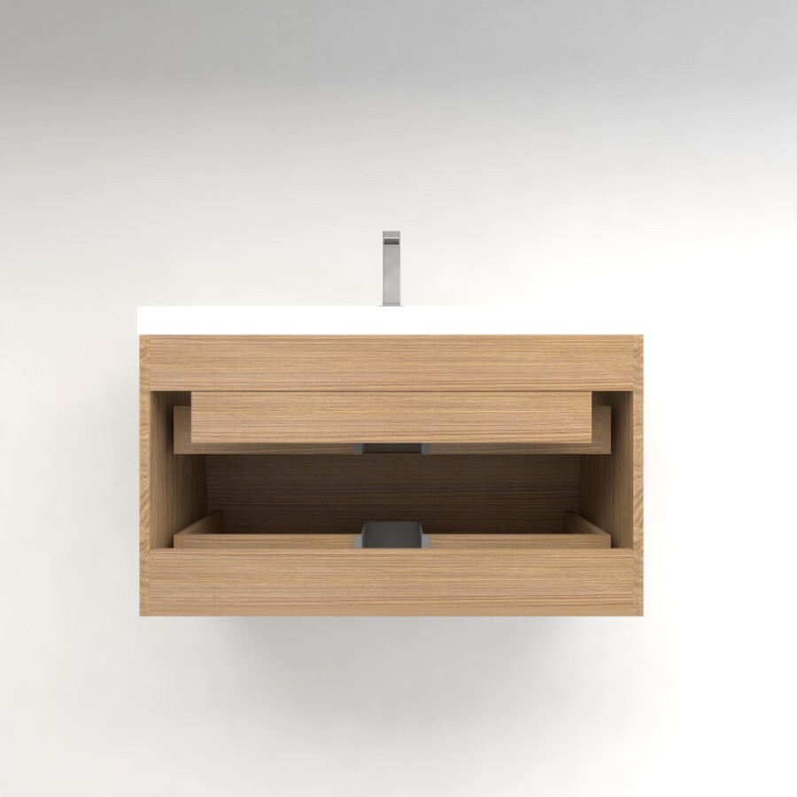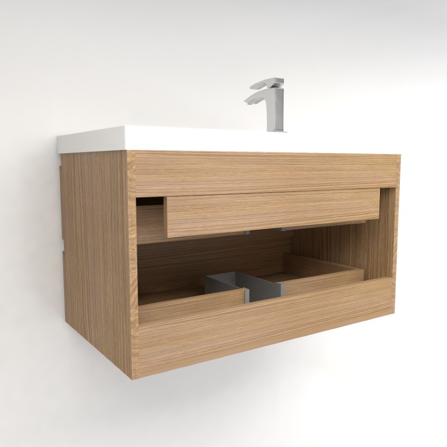 The Botto series accentuates and elevates any modern bathroom with its seamless design. A rectangular basin sink is integrated within the reinforced acrylic counter for a flawless aesthetic. Built into the moisture and water-proof base are two soft-close drawers that offer ample room for toiletries and towels.