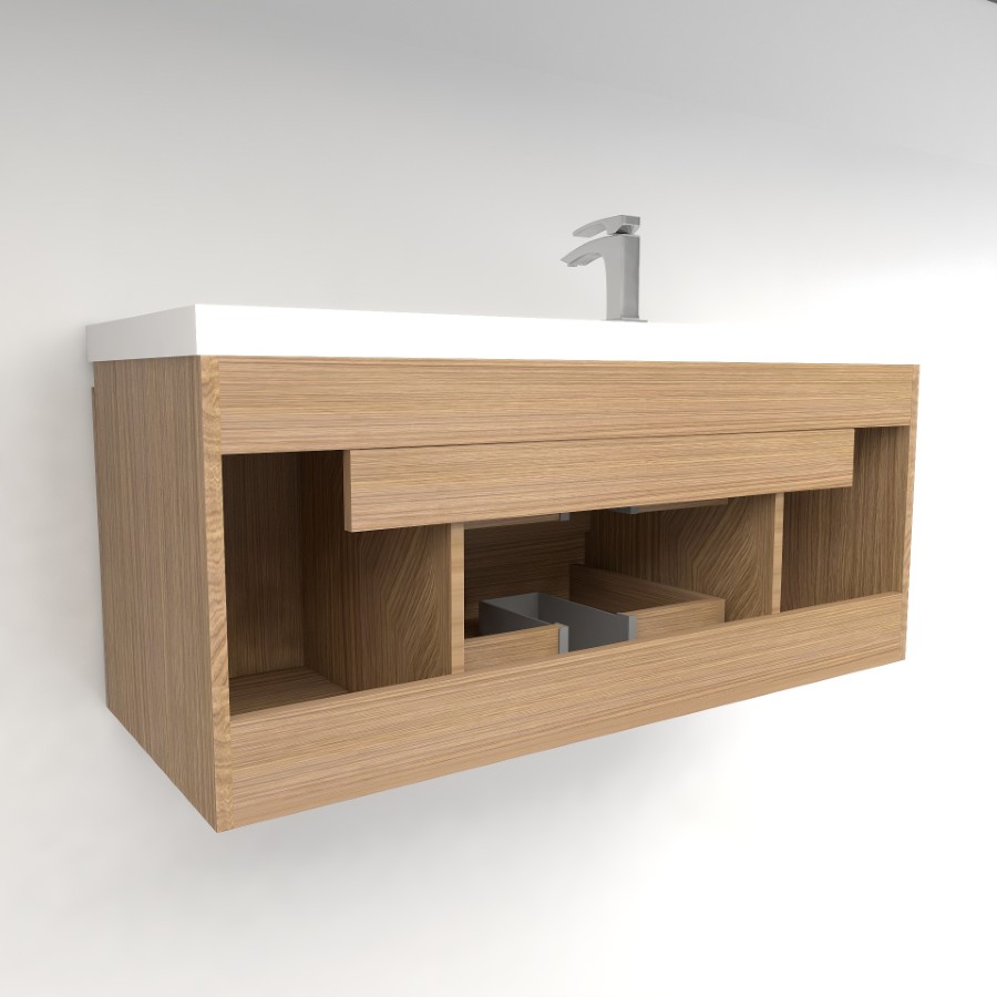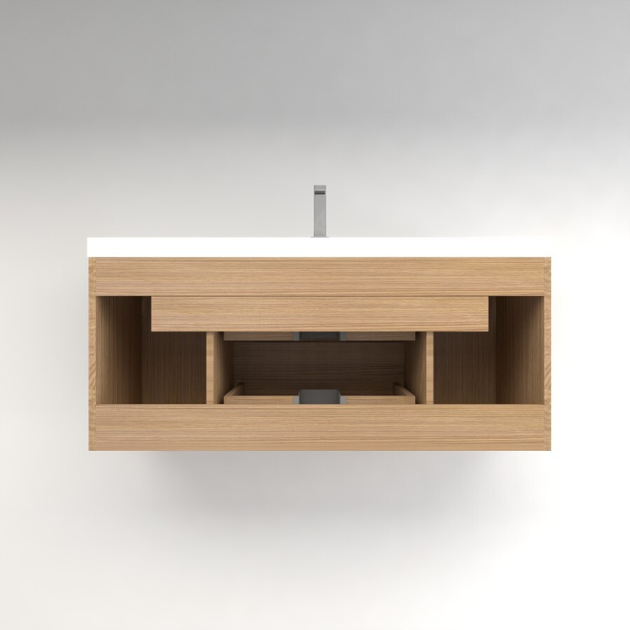 The Botto series accentuates and elevates any modern bathroom with its seamless design. A rectangular basin sink is integrated within the reinforced acrylic counter for a flawless aesthetic. Built into the moisture and water-proof base are two soft-close drawers that offer ample room for toiletries and towels.