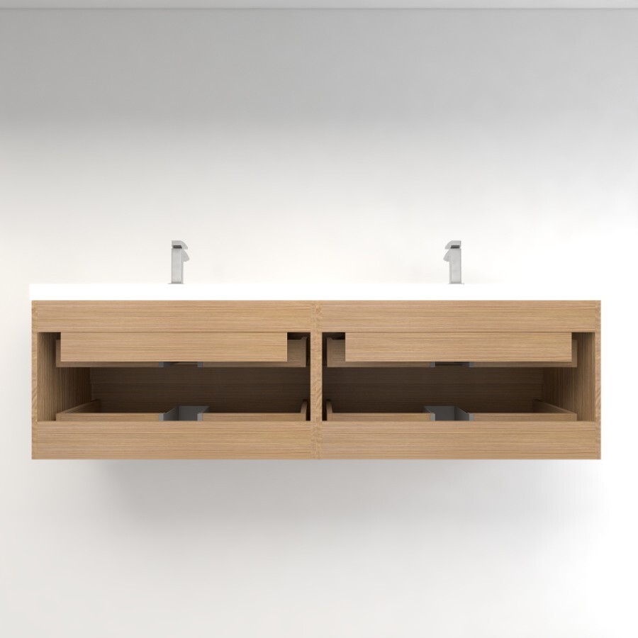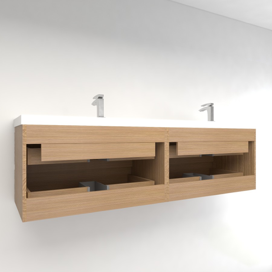 The Botto series accentuates and elevates any modern bathroom with its seamless design. A rectangular basin sink is integrated within the reinforced acrylic counter for a flawless aesthetic. Built into the moisture and water-proof base are two soft-close drawers that offer ample room for toiletries and towels.