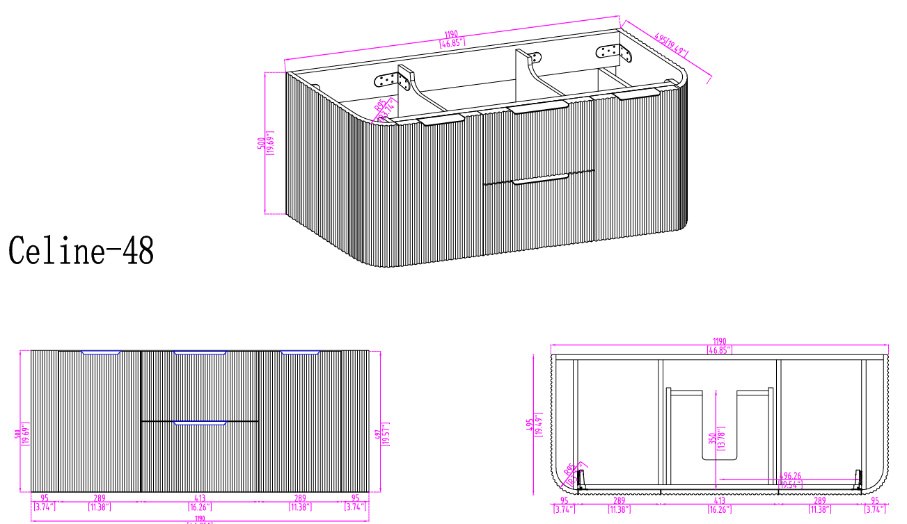 Vanity-CelineIntroducing the Celine 48" Wallmounted Bathroom Vanity – an exquisite blend of fluted rounded natural texture and modern minimalism. Designed to create a serene and sophisticated atmosphere, the Celine features a captivating vertically fluted cabinet available in a rich Chestnut Brown, White Oak & Black finish. This wall-mounted vanity not only serves as a stunning focal point but also enhances the sense of space in your bathroom, making it the perfect centerpiece for powder rooms and compact bathrooms alike.